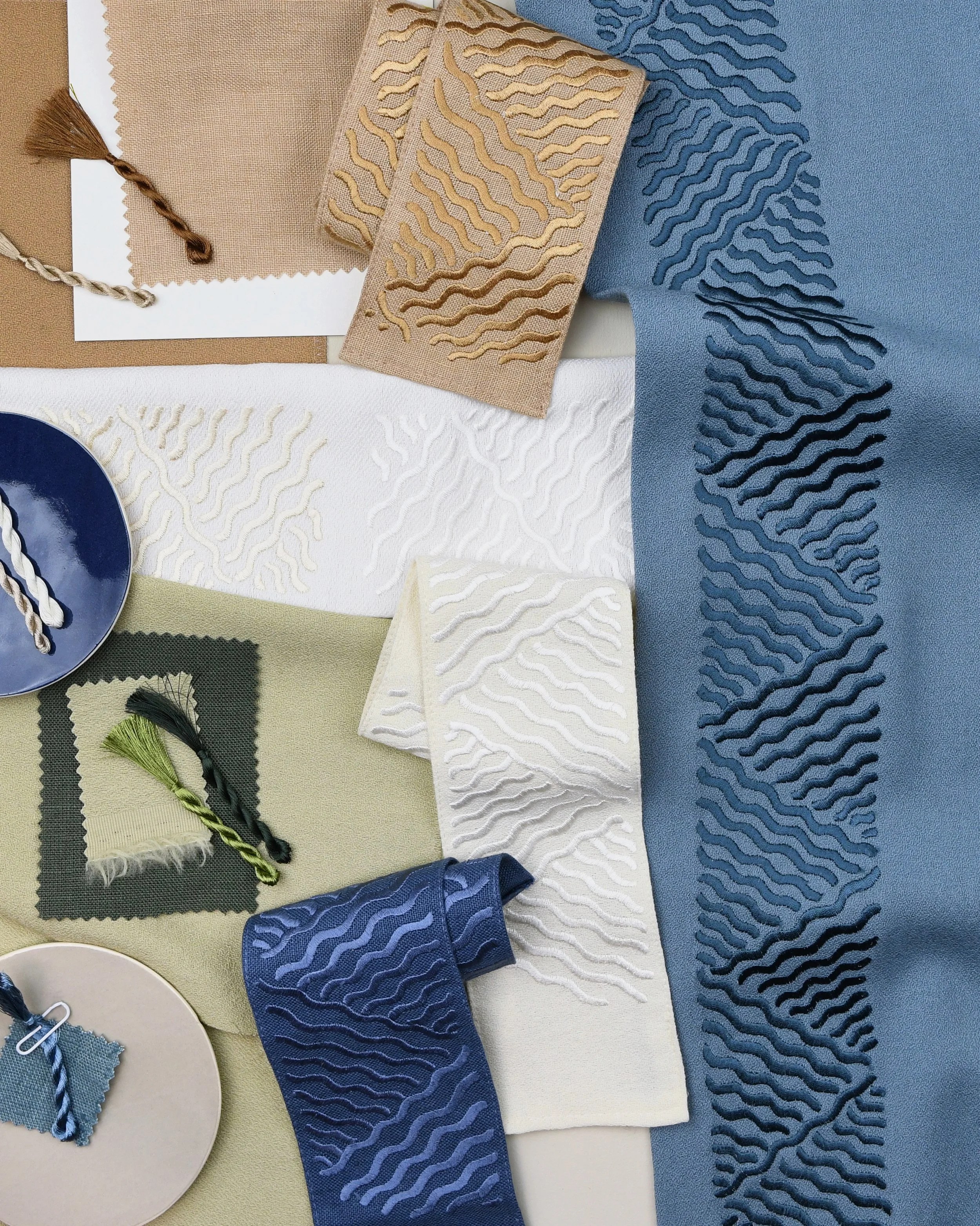 From scalloped motifs to rhythmic stitched stripes, our embroidered borders bring crafted definition and decorative detail to interior textiles. Each design is made to order in the UK, embroidered directly onto cloth by skilled artisans. Whether framing curtains, cushions or upholstery, these borders are designed to work seamlessly with our wider collection of fabrics and trims, offering a refined, bespoke detail for your projects.